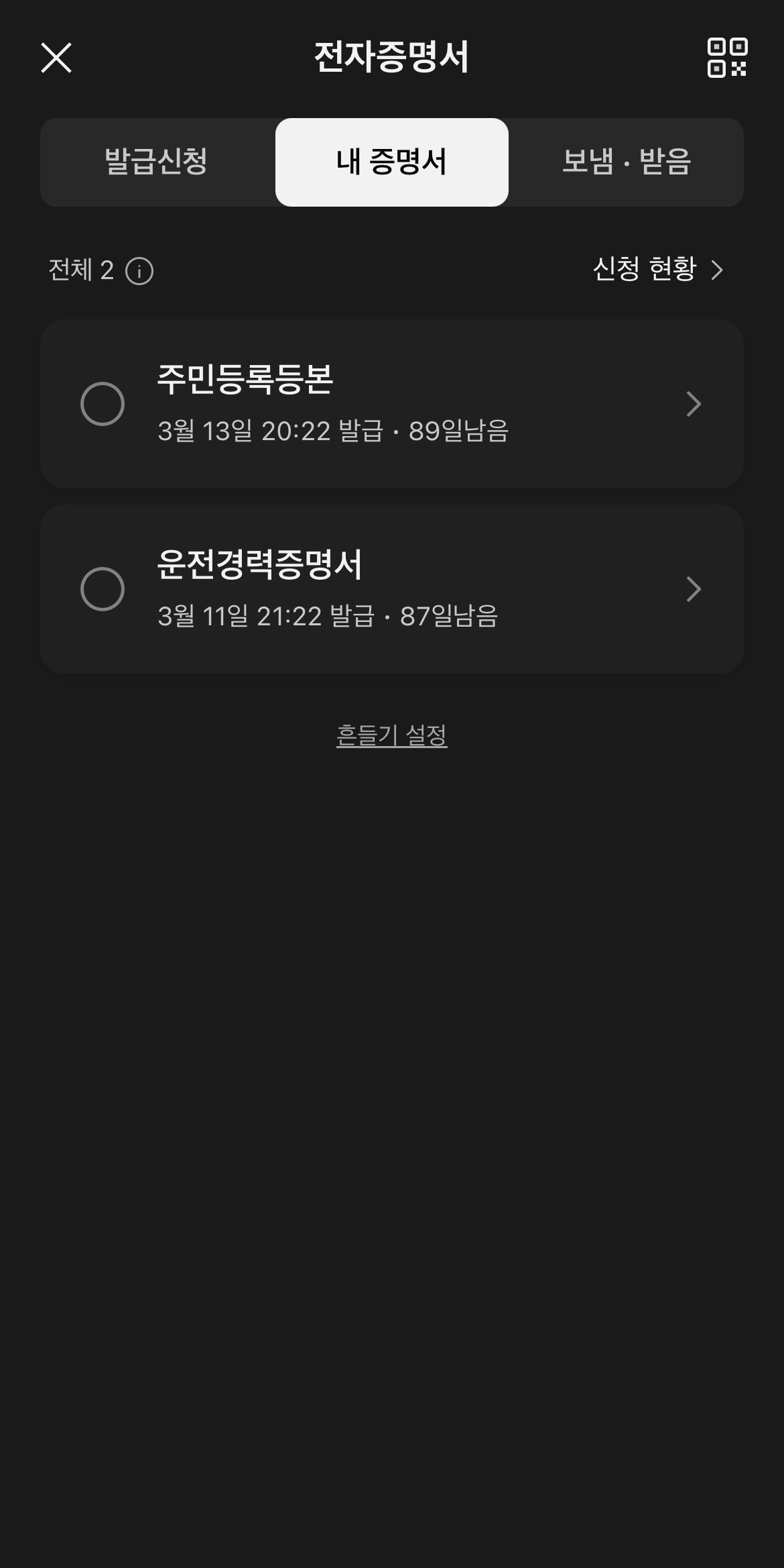증명서 발급중이라는 문구와 함께 나의 주민등록등본 또는 운전경력증명서가 발급된 것을 볼 수 있을 것이다. 매우 간단하게 카카오톡 모바일 신분증 발급을 했다. 급하게 신분증이 필요할 경우 이 방법을 통하여 급한 불을 끌 수 있을 것이다. 이렇게 발급된 전자증명서는 90일까지 유효하며 90일이 지나면 자동으로 소멸된다.