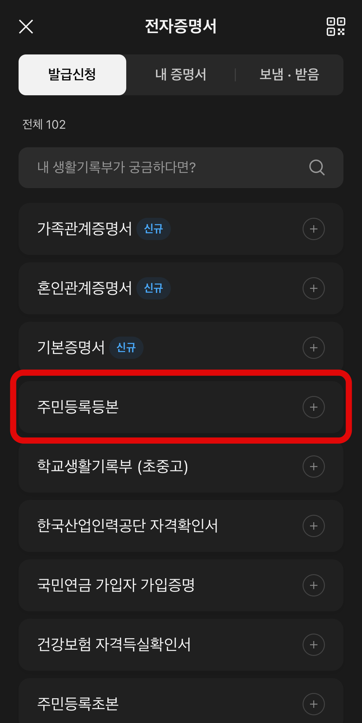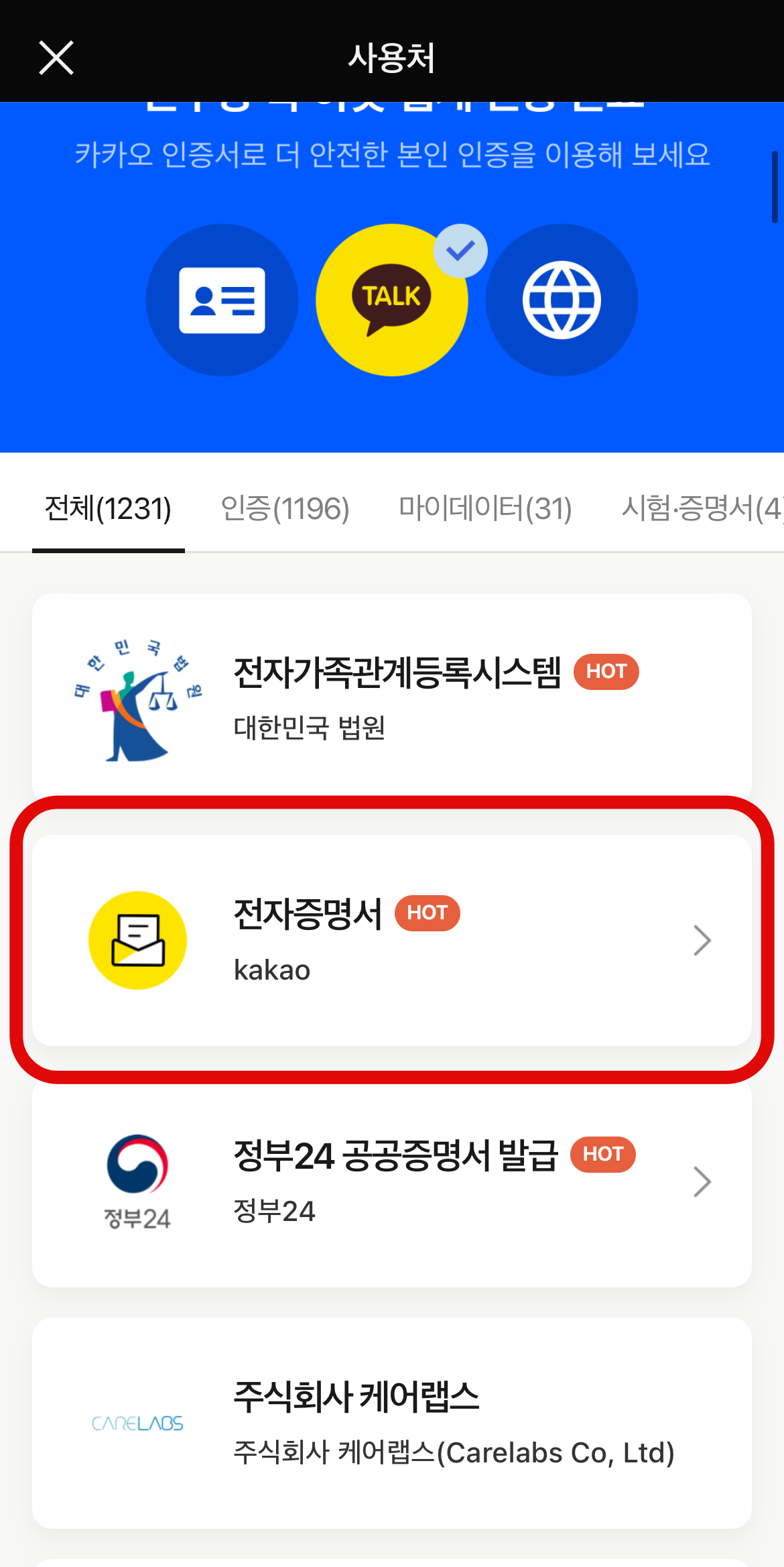 사용처를 누르면 다양한 인증서를 받을 수 있는 화면이 나올 것이다. 여기서 중간에 있는 전자증명서를 누른다. 그리고 주민등록등본이나 운전경력증명서 중 원하는 신분증을 선택한다. 그리고 거기에 맞는 정보를 입력한 후 신청하기를 누르면 카카오톡 모바일 신분증 발급이 벌써 다 된 것이다.