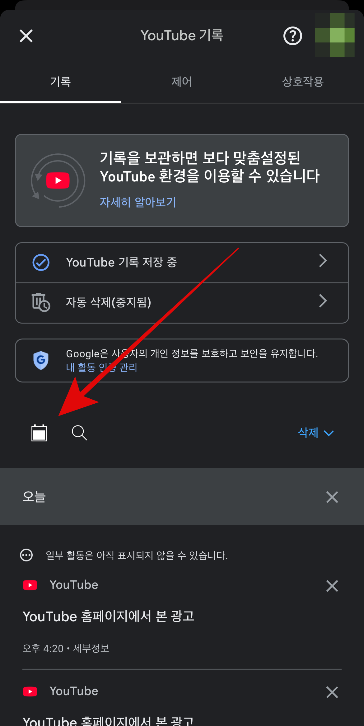 유튜브 시청기록 전체 삭제 말고 오래전에 본 시청기록 하나를 지우고 싶다면 이렇게 할 수 있다. 앞의 방법과 마찬가지로 내 페이지에서 오른쪽 위에 있는 점 3개 버튼을 누른다. 그리고 시청 기록 삭제가 아닌 가장 아래에 있는 전체 기록 관리로 들어가자. 그러고 나서 달력모양을 눌러 그 영상을 시청한 날짜를 입력한다. 유튜브 시청기록 삭제를 하고 싶은 영상 오른쪽에 있는 x를 누르면 시청기록에서 삭제할 수 있다.