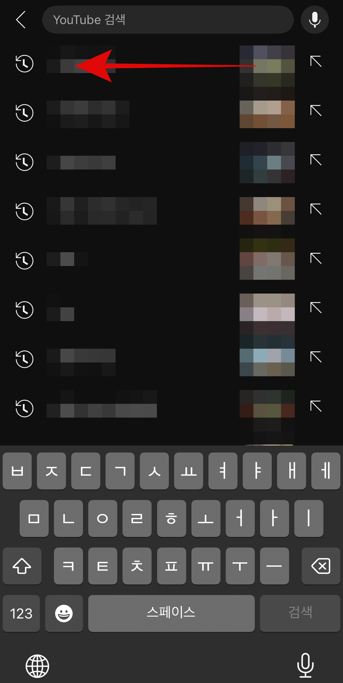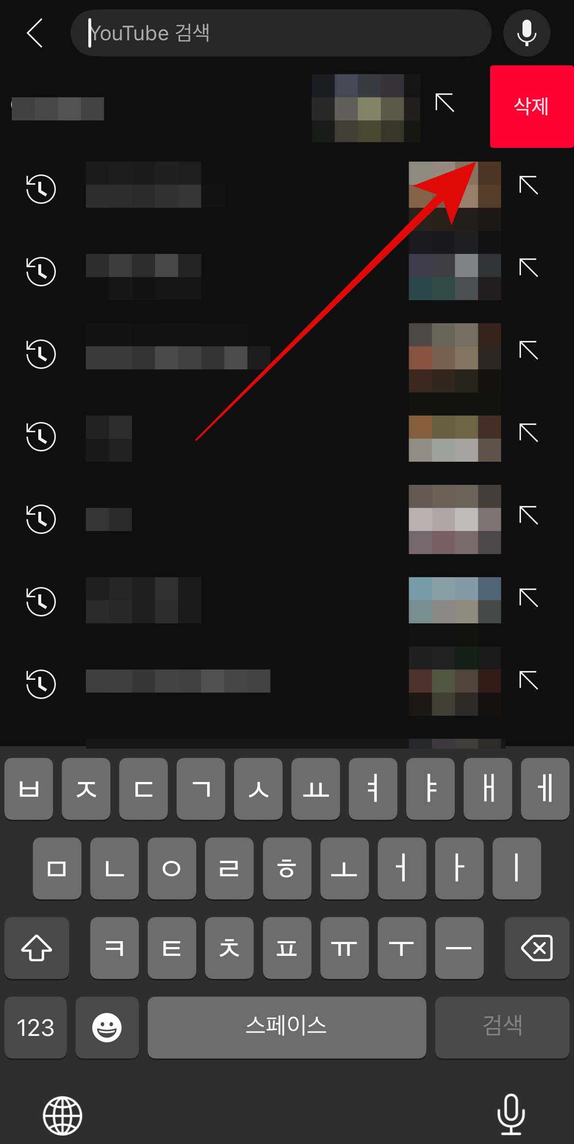 먼저, 유튜브 검색기록 삭제하는 방법에 대하여 알아보자. 검색기록 삭제하는 방법은 매우 간단하다. 유튜브에 들어가서 검색을 하듯이 오른쪽 위에 있는 돋보기모양을 누른다. 그러면 이때까지 내가 검색을 한 내역들이 쭉 나올 것이다. 여기서 유튜브 검색기록 삭제를 하고 싶은 기록을 왼쪽으로 스와이프 하면 삭제를 할 수 있는 버튼이 나온다. 삭제를 누르면 그 검색기록은 삭제된다.