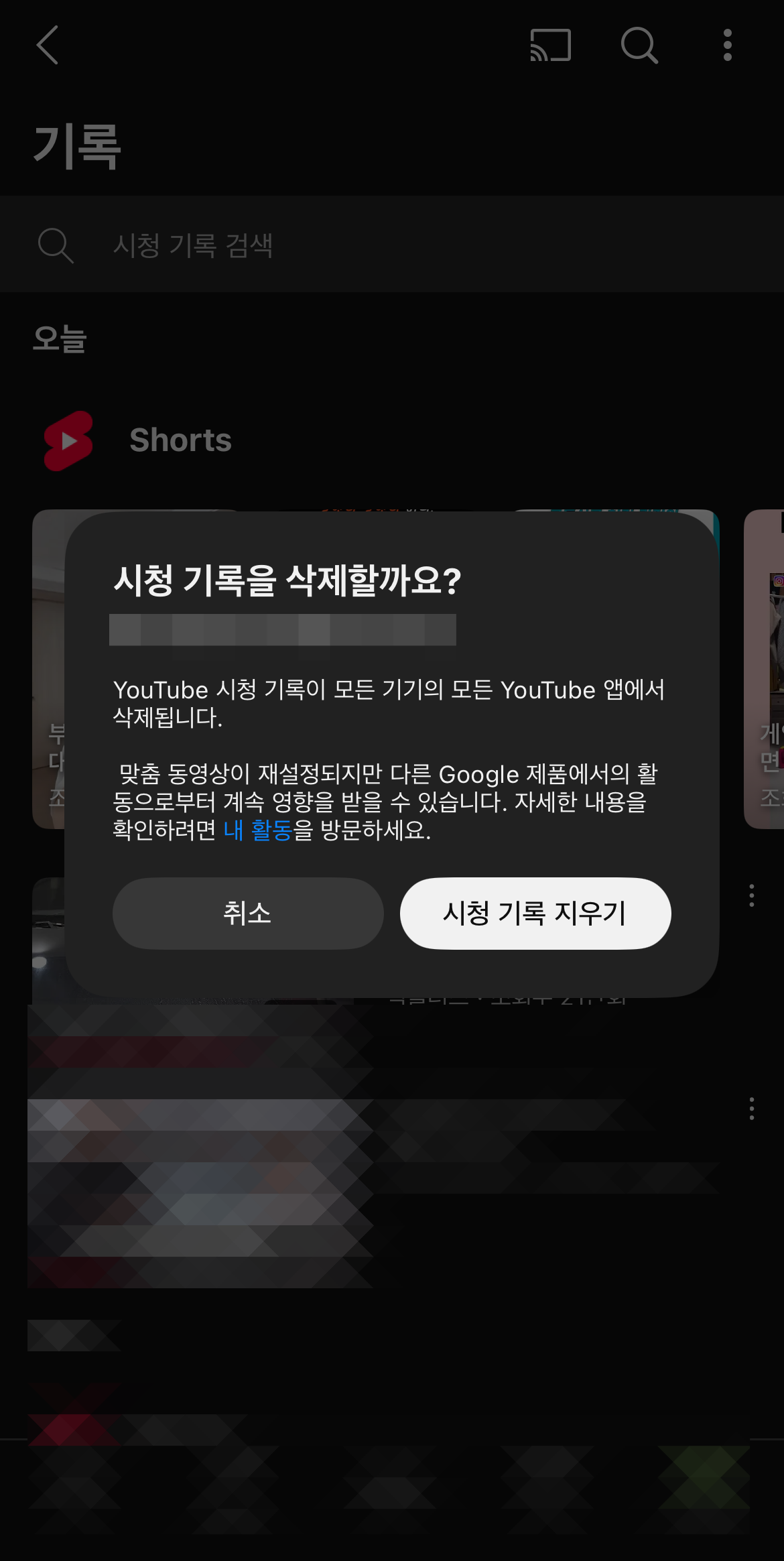 하나의 시청 기록이 아닌 전체 유튜브 시청기록 삭제를 원한다면 동영상 오른쪽 위의 점 3개 버튼이 아니라 내 페이지에서 가장 오른쪽 위에 있는 점 3개 버튼을 눌러보자. 그리고 두 번째에 나오는 시청 기록 지우기를 누르면 이때까지 시청했던 모든 기록들이 삭제된다. 유튜브 알고리즘이 나랑 맞지 않다면 이 방법을 통하여 초기화를 할 수 있다.