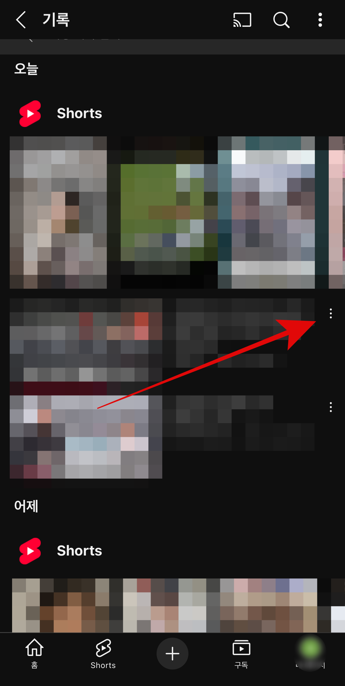 다음으로는 유튜브 시청기록 삭제하는 방법이다. 시청기록 삭제하는 방법도 간단하게 할 수 있다. 유튜브에 들어와서 오른쪽 아래에 있는 내 페이지로 들어간다. 그러면 최신순으로 내가 봤던 시청기록들이 쭉 나올 것이다. 여기서 유튜브 시청기록 삭제를 하고 싶은 영상의 오른쪽 위를 보면 점 3개 버튼이 보일 것이다. 쇼츠영상도 마찬가지로 점 3개를 눌러보자. 가장 위에 시청 기록에서 삭제를 눌러주면 해당 영상을 시청하지 않은 것처럼 시청기록에서 삭제가 된다.