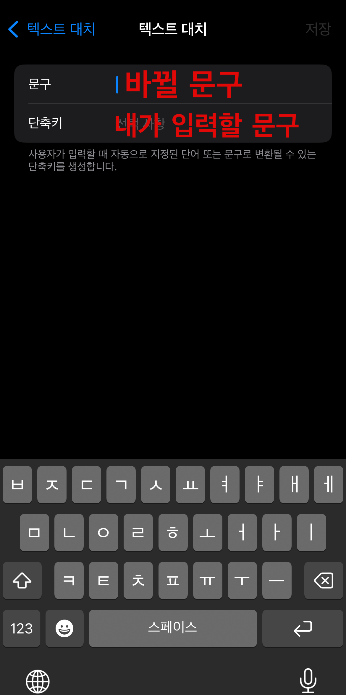 아이폰 텍스트 대치에 처음 들어오면 ㅈㄱㅈ - 지금 가는 중! 만 있을 것이다. 여기서 새로운 텍스트 대치를 추가하기 위하여 오른쪽 위에 있는 +버튼을 누른다. 그리고 여기서 문구에다가는 변환되어 적힐 문구를 입력해 주고 아래 단축키에다가는 내가 입력할 문구를 적으면 된다. 자주 사용하는 집 주소로 예를 들자면 위(문구)에 구체적인 주소를 적고 아래(단축키)에 집이라고 입력을 한다. 그리고 오른쪽 위에 있는 저장 버튼을 누르자.
