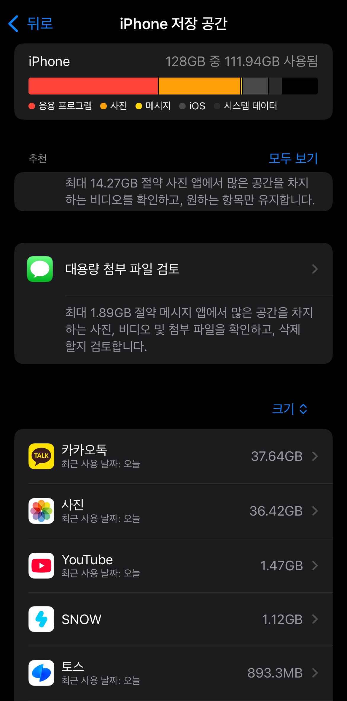 아이폰 저장공간 늘리기 전에 먼저 확인해야 할 사항이 있다. 나의 용량이 어디서 가장 많이 사용되고 있는지 알아야 한다. 그걸 확인하기 위해서 설정에 들어가서 일반으로 들어간다. 그리고 아이폰 저장공간이라는 탭으로 들어가 보자. 그러면 여기에 나의 아이폰이 어디에 가장 많은 용량을 사용하고 있는지 나올 것이다. 모든 사람들은 아닐 수도 있지만 대부분의 사람들은 가장 큰 용량이 카카오톡 아니면 사진일 것이다.