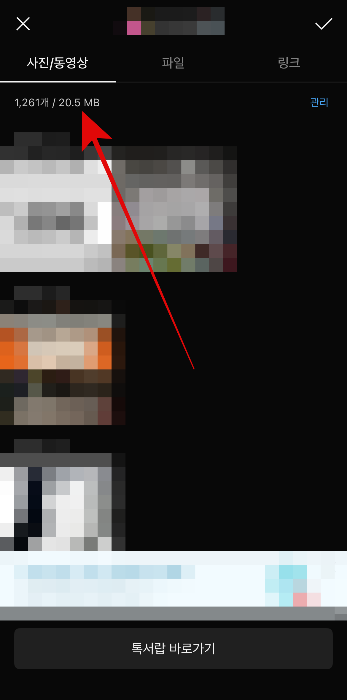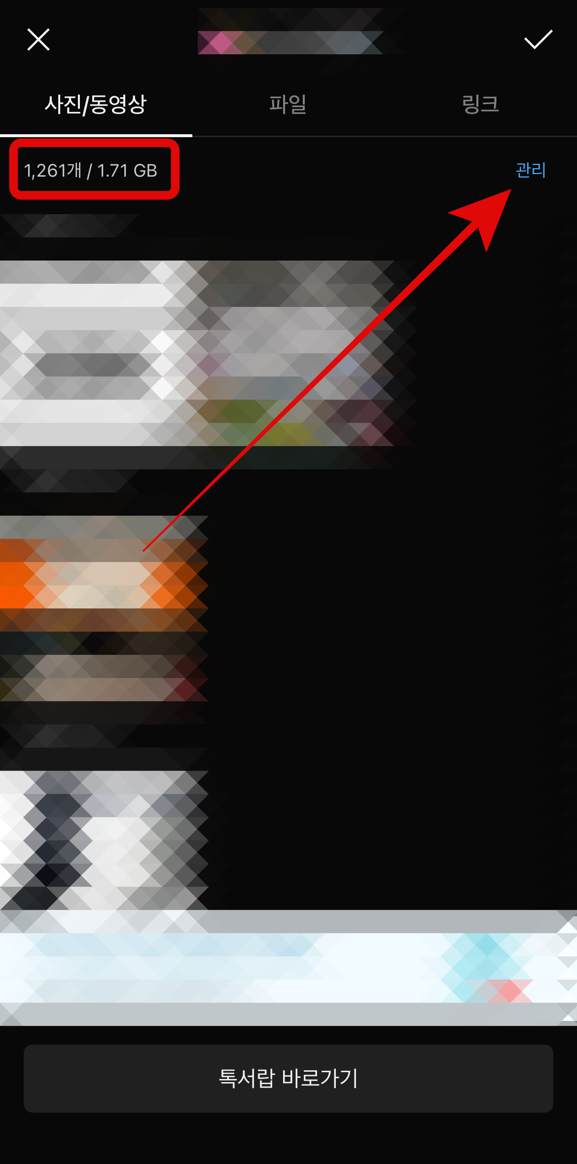 먼저, 카카오톡의 필요 없는 사진, 동영상을 삭제를 통하여 아이폰 저장공간 늘리기 방법이다. 카카오톡에 들어가서 사진을 많이 주고받았던 카톡방으로 들어간다. 오른쪽 위에 있는 삼선버튼을 누르고 사진/동영상을 누른다. 그러면 이 카톡방에서 얼마 큼의 사진과 동영상을 주고받았는지 나오며 이 용량을 삭제할 수 있다. 꼭 필요한 사진이나 동영상은 저장을 통하여 사진첩으로 저장을 해놓고 오른쪽에 있는 관리를 눌러보자.