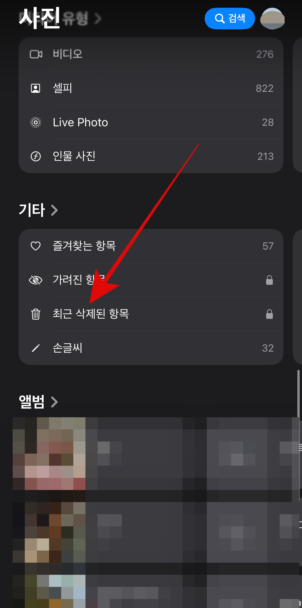 아이폰 사진첩으로 들어와서 스크롤을 내리다 보면 최근 삭제된 항목이라는 카테고리를 볼 수 있을 것이다. 여기에 들어가 보면 내가 분명 삭제한 사진과 동영상인데 아직 보관되고 있는 것을 볼 수 있을 것이다. 이 항목들도 나의 아이폰 저장공간 늘리기에 방해를 하고 있다. 이 항목들을 삭제를 하면 빠르게 저장공간 확보를 할 수 있다.