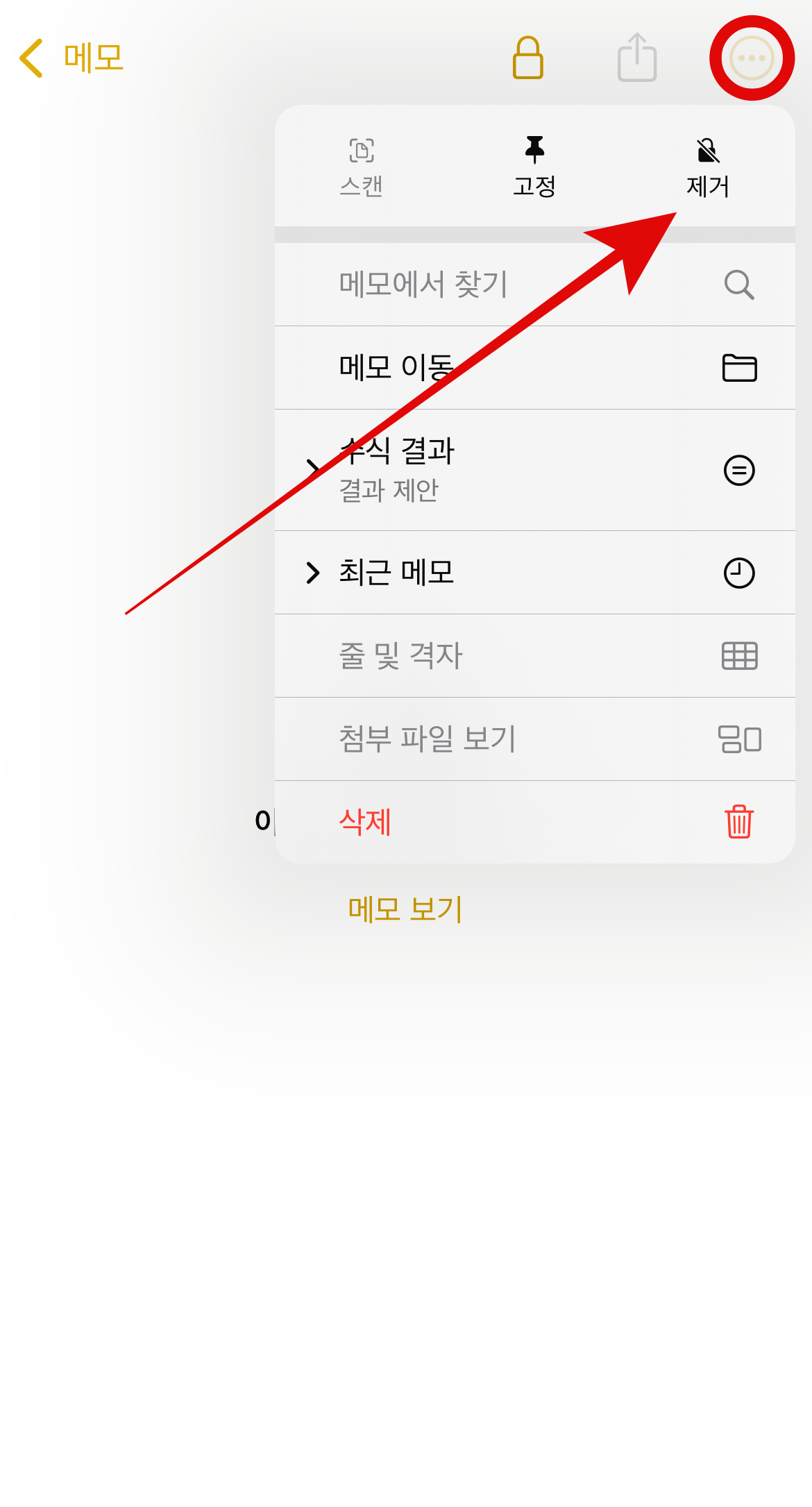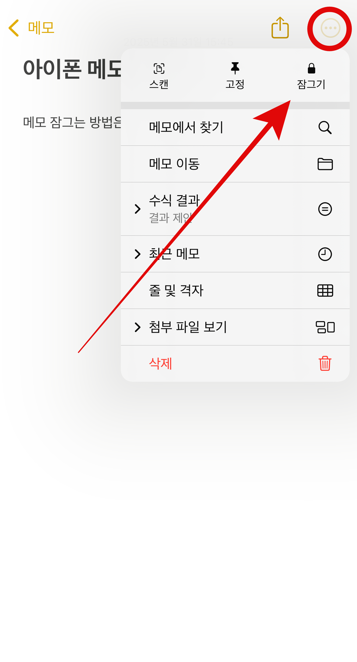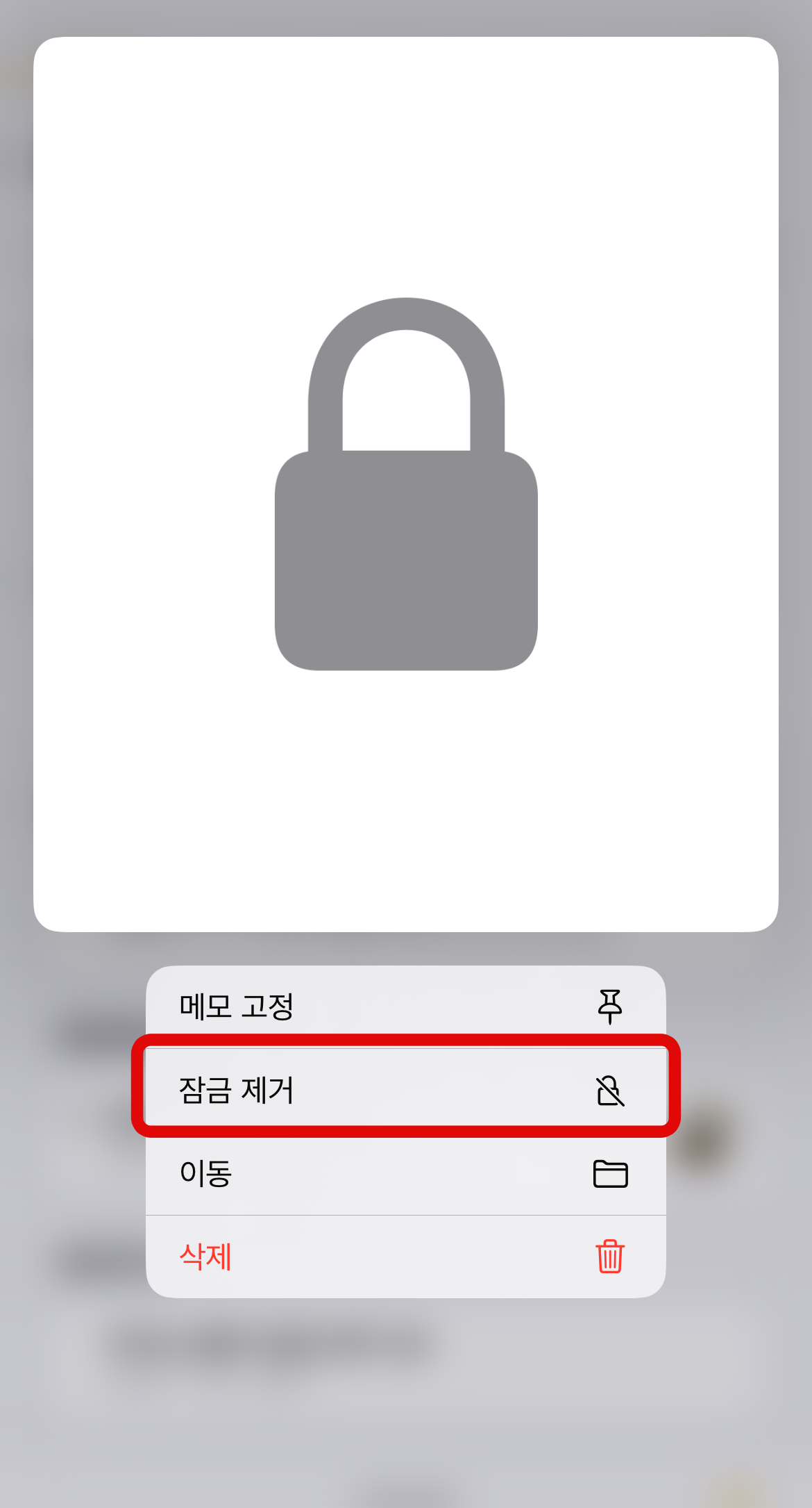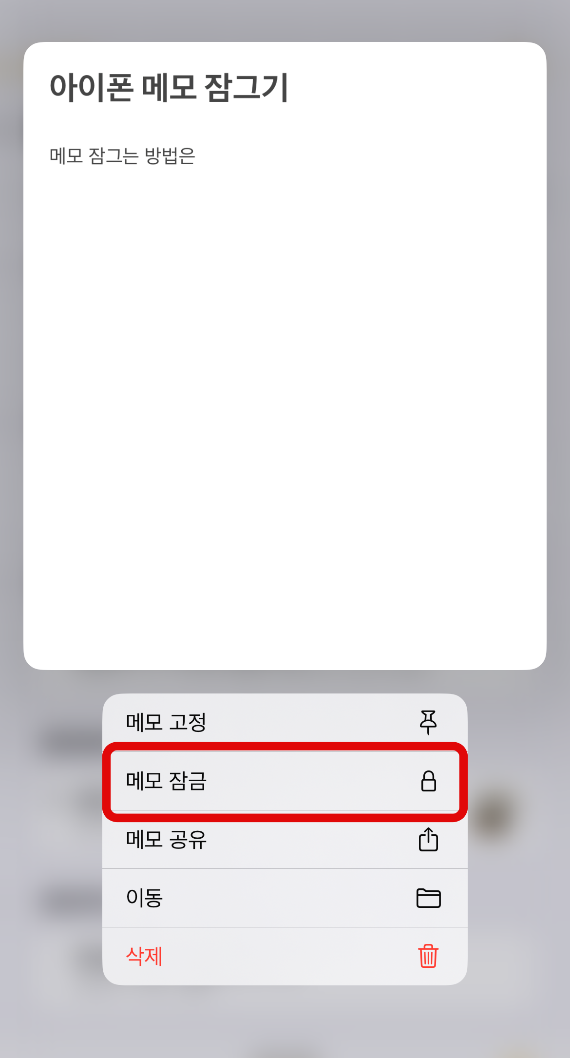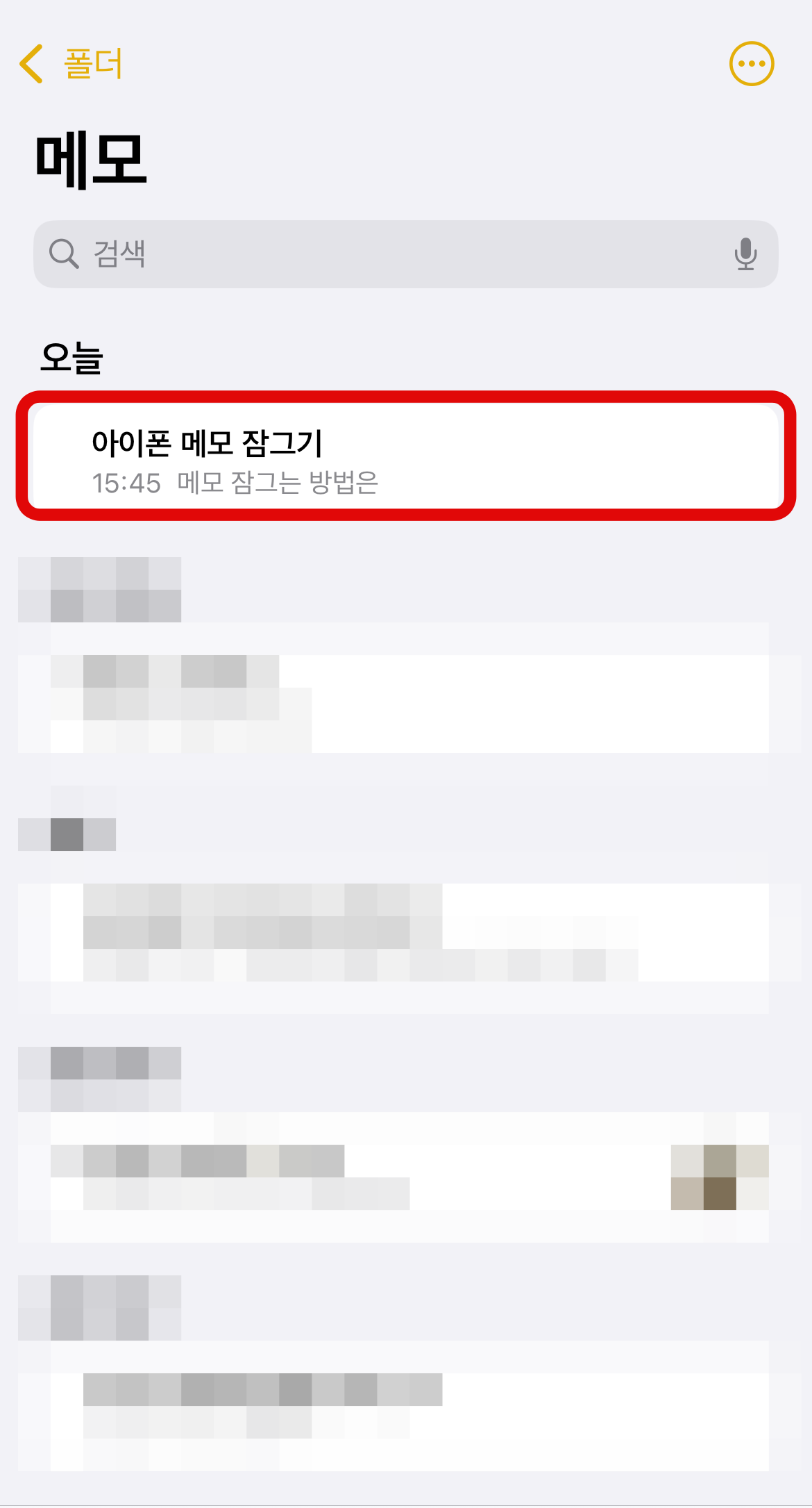 아이폰 메모 잠금 두 번째 방법으로는 메모 전체를 잠그는 것이 아니라 내가 원하는 메모만 잠글 수 있다. 많은 메모 중 잠그고 싶은 메모를 꾹 눌러 메모 잠금을 할 수 있다. 그리고 잠그고 싶은 메모에 들어가서 오른쪽 위에 보이는 점 세 개 버튼을 눌러 바로 아래에 있는 잠그기 버튼을 눌러도 아이폰 메모 잠금이 가능하다. 이 방법은 내가 원하는 메모만 잠금을 할 수 있어서 다른 사람에게 보여주기 싫은 메모만 잠글 수 있는 장점이 있다.