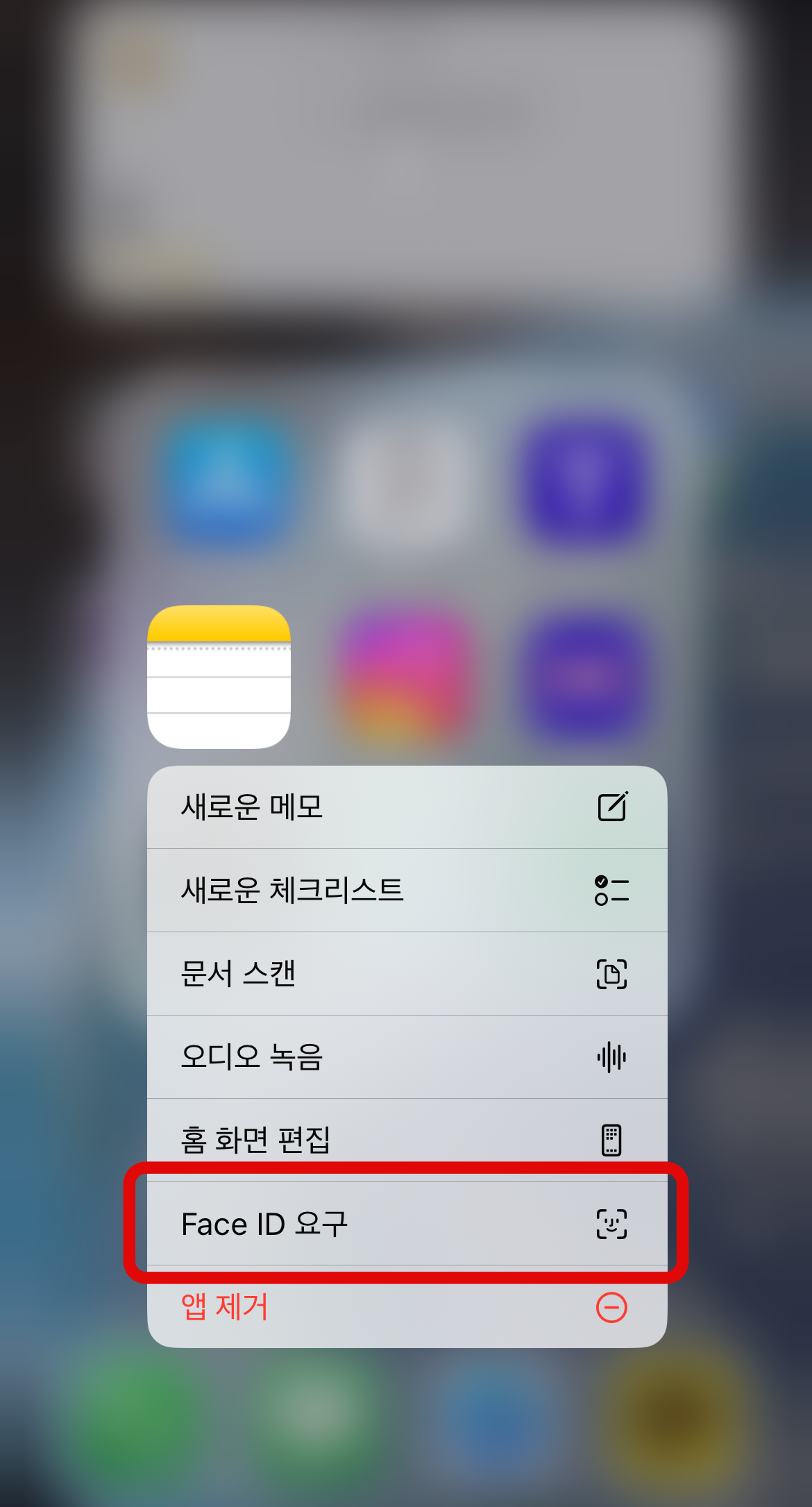 아이폰 메모 잠금 첫 번째 방법은 메모 어플을 전체적으로 잠그는 방법이다. 메모어플을 찾아 꾹 눌러보면 메모 어플에 대한 다양한 기능들이 나온다. 여기서 아래에 보이는 Face ID 요구를 눌러보자. 그러면 '메모 앱에 대하여 페이스아이디를 요구하겠습니까?'라는 문구와 함께 메모 앱을 잠글 수 있다. 그리고 메모를 눌러보면 얼굴인식이 되어야 메모가 열리는 것을 확인할 수 있을 것이다.