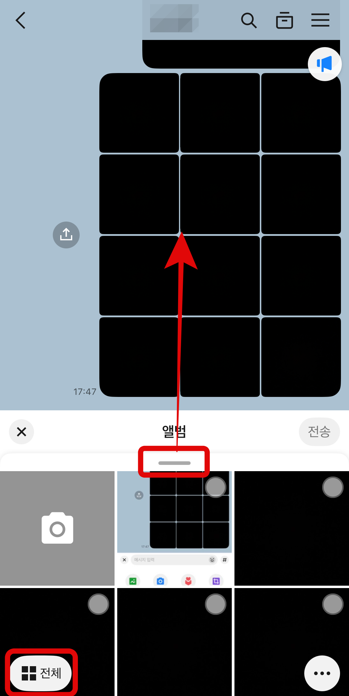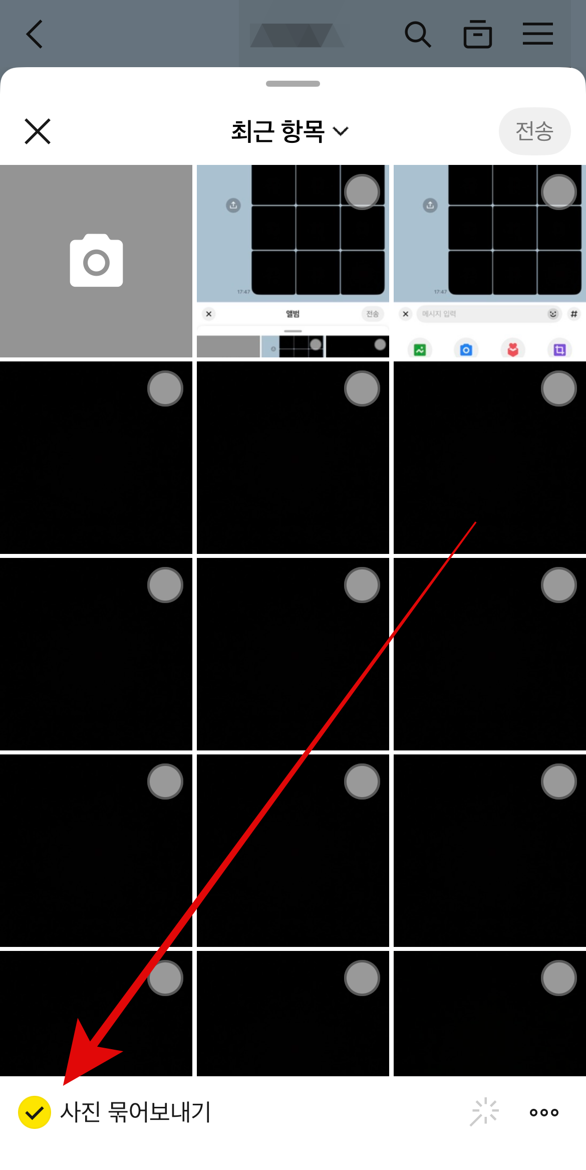 카카오톡 사진 묶어보내기 모바일로는 매우 매우 간단하다. 원래 사진을 보내는 것처럼 해보자. 먼저 카톡방에 들어가서 메시지 입력 옆에 있는 +버튼을 눌러 앨범을 누른다. 그러면 사진을 선택하여 보낼 수 있는데 바로 보내지 말고 왼쪽 아래에 있는 전체버튼을 누르거나 가운데 있는 스크롤바를 위로 올려보자. 그러면 사진을 여러 장 볼 수 있는데 여기서 왼쪽 아래에 있는 사진 묶어보내기를 체크해 주면 된다. 이렇게 하면 모바일 카톡 사진 묶어보내기는 끝이 나며 한 번 설정을 해놓으면 다음부터는 자동으로 묶어보내기로 설정이 되어 있을 것이다.