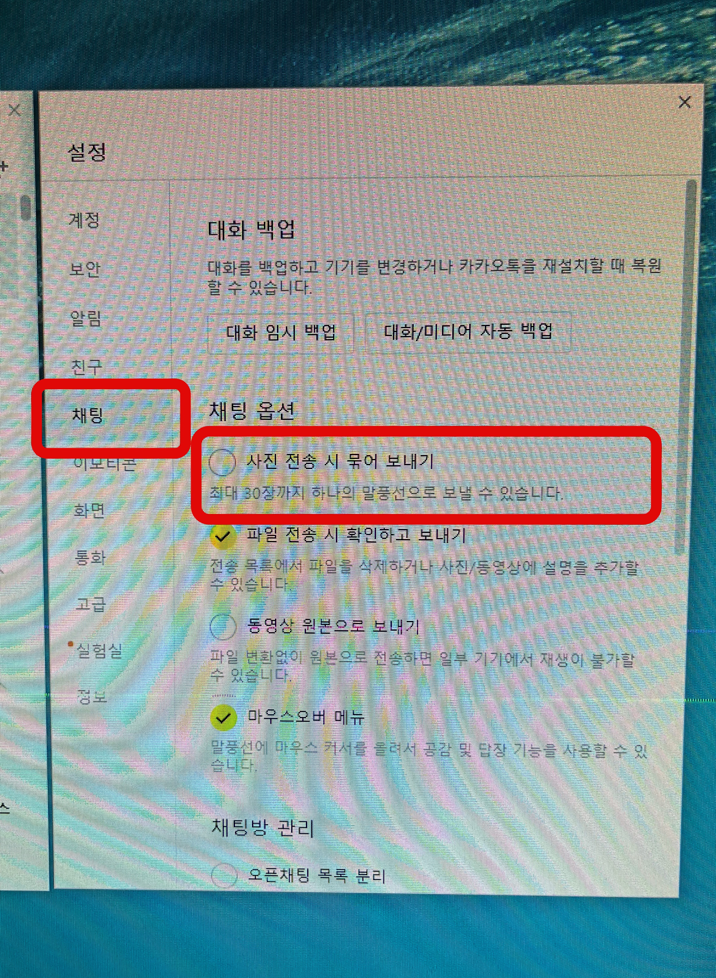 카카오톡 사진 묶어보내기 PC버전에서는 조금 다르다. 똑같이 사진을 보내는 곳에서 찾아보았지만 없으며 채팅설정에서 활성화를 시킬 수 있다. 먼저 PC 카카오톡에 로그인을 하고 왼쪽 아래에 있는 톱니바퀴 모양을 누른다. 그리고 설정을 눌러주면 오른쪽에 설정창이 뜨는 것을 확인할 수 있다. 여기 있는 다양한 카테고리 중 채팅으로 들어가면 '사진 전송 시 묶어 보내기'가 보일 것이다. 이 버튼을 눌러 활성화시켜주면 PC에서도 카카오톡 사진 묶어보내기가 가능해진다.