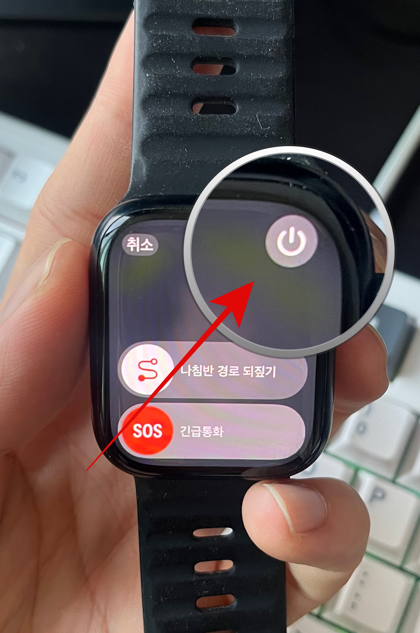애플워치 재부팅하는 방법은 애플워치 오른쪽 크라운 밑에 있는 측면버튼을 꾹 눌러보자. 측면버튼을 꾹 누르면 나침반 경로 되짚기, 긴급통화를 할 수 있는 화면이 나올 텐데 여기서 오른쪽 위에 있는 전원버튼을 누른다. 그리고 슬라이드를 해서 밀어주면 애플워치가 꺼지는 것을 볼 수 있다. 애플워치가 완전히 꺼졌다면 다시 켤 때도 측면버튼을 꾹 눌러주면 애플워치가 켜질 것이다.