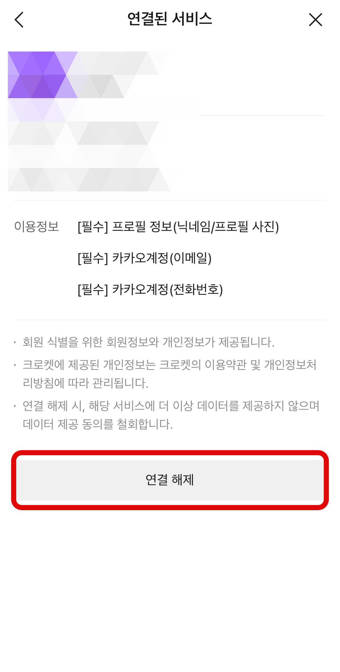 계정 이용에 들어오면 현재 나의 카카오계정과 연결된 서비스들을 볼 수 있다. 여기서 카톡 광고 차단하는 법은 외부서비스로 들어가야 한다. 외부 서비스는 카카오톡 외에 다른 외부 사이트와 연결이 된 서비스를 보여준다. 여기서 자신이 사용하지 않는 서비스에 들어가서 아래에 보이는 연결 해제를 눌러주면 된다. 광고성 메시지가 오지 않더라도 사용하지 않는 서비스가 있다면 연결 해제를 하는 것이 좋다. 나의 정보가 해당 서비스에 제공되는 것을 막아주기 때문이다.