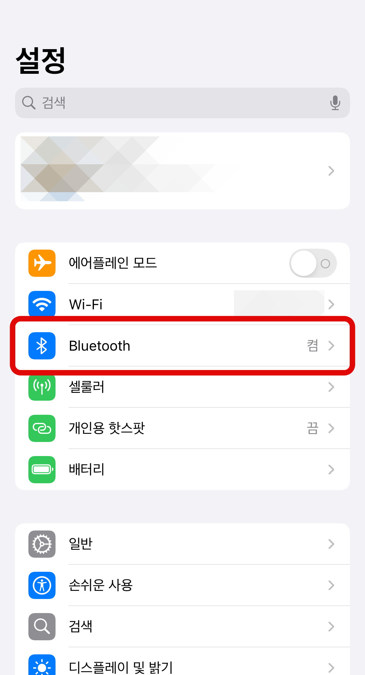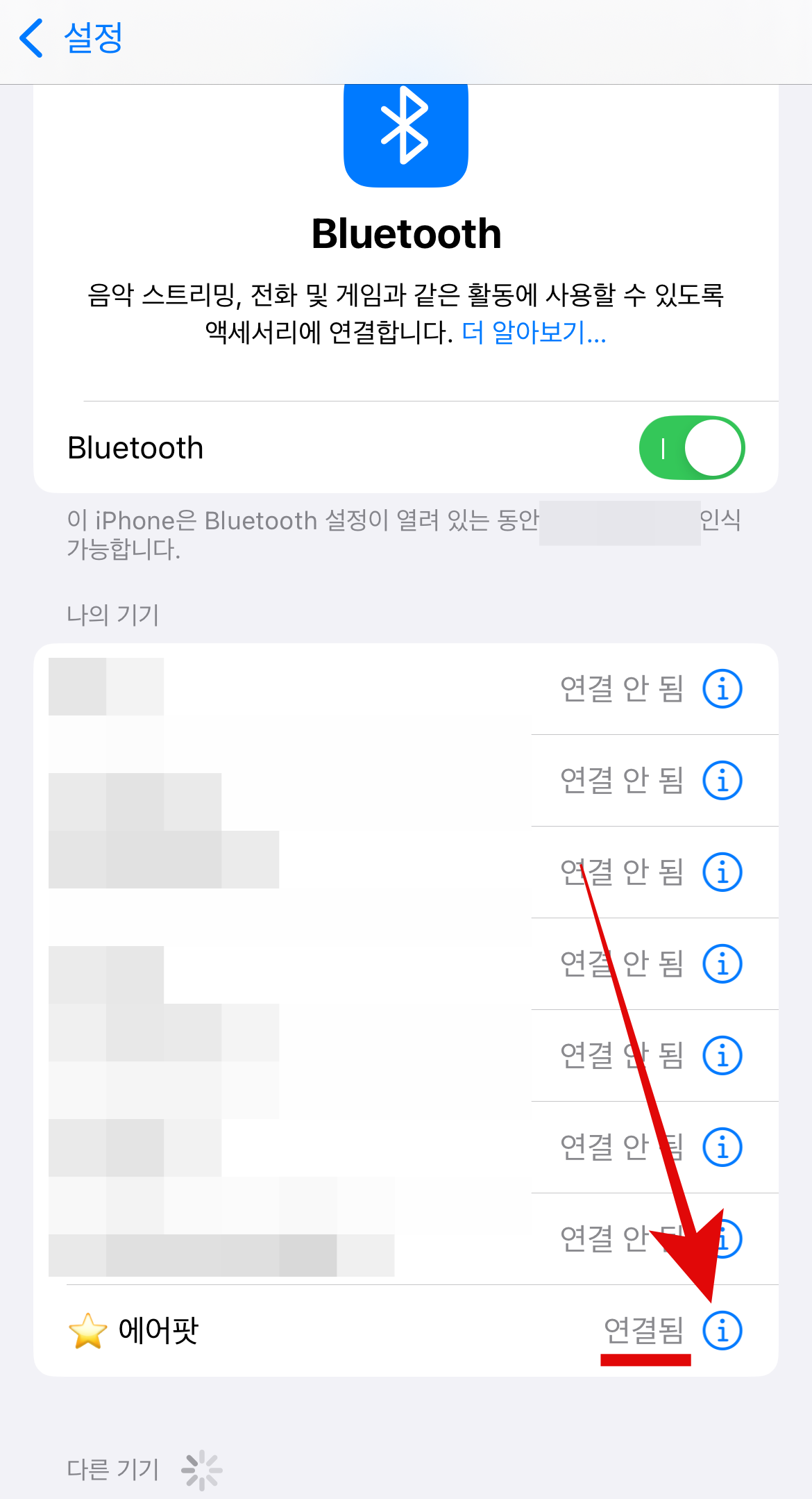 에어팟 이름 바꾸기 방법은 매우 간단하다. 먼저, 설정에 들어가서 블루투스로 들어가자. 에어팟을 종종 연결을 했다면 나의 기기에 추가가 되어 있을 것이다. 아니면 에어팟을 블루투스로 연결하면 된다. 연결이 안 된 상태에서는 에어팟 이름 바꾸기가 불가능 하니 꼭 블루투스에 연결을 하고 오른쪽에 있는 파란색 i 버튼을 누른다.