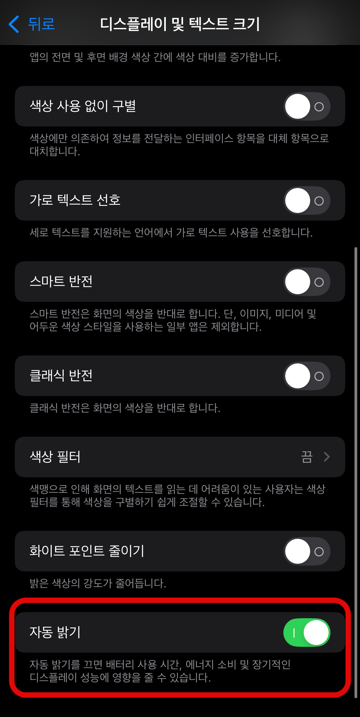 이렇게 아이폰 화면 어두워짐 밝기 자동 꺼짐에 대하여 알아보았다. 휴대폰 메시지나 메모를 작성 중에 잠시 생각을 하는 데 화면이 꺼지면 시간을 늘릴 필요가 있을 것이고 휴대폰 사용을 다 하고 내려놓았는데도 화면이 오래도록 켜져 있다 꺼진다면 줄일 필요도 있을 것이다. 뿐만 아니라 자동 밝기가 많은 스트레스를 준다면 끄는 것이 좋고 딱히 불편함을 못 느낀다면 켜놓는 것이 아이폰에게는 좋다고 생각한다.