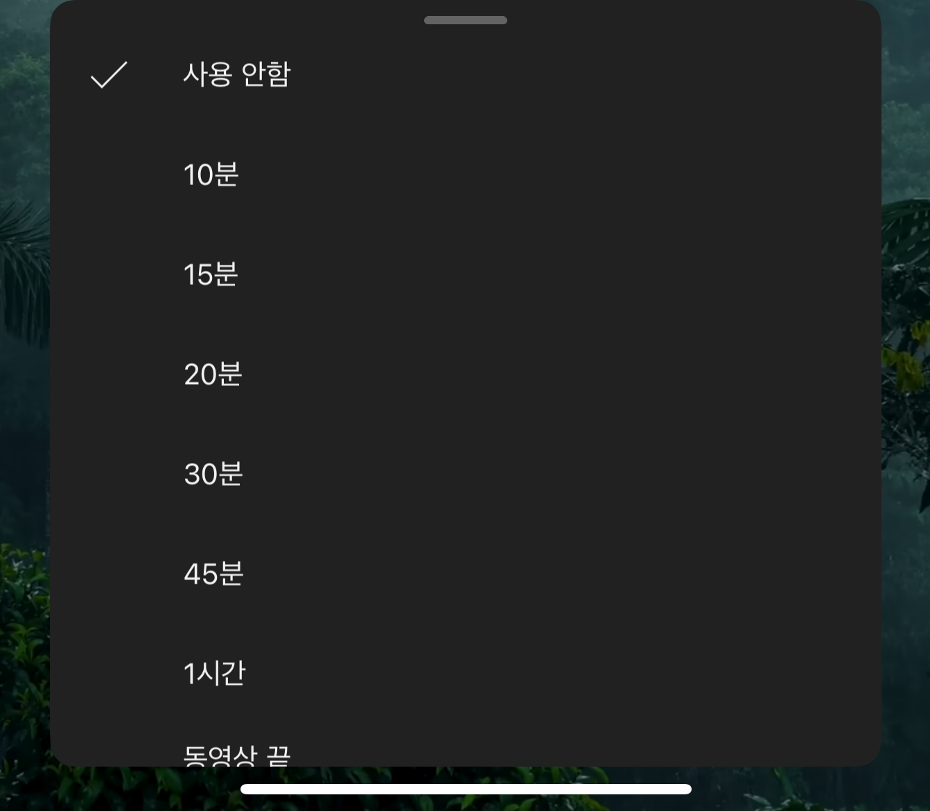 유튜브 취침타이머 설정으로 들어오면 10분부터 동영상 종료 시까지 시간을 정할 수 있다. 원하는 시간을 선택하면 영상 하단부에 남은 시간을 볼 수 있다. 이 남은 시간은 조금 있으면 사라지며 다시 보고 싶다면 화면모드를 가로나 세로로 바꾸어 주면 된다.