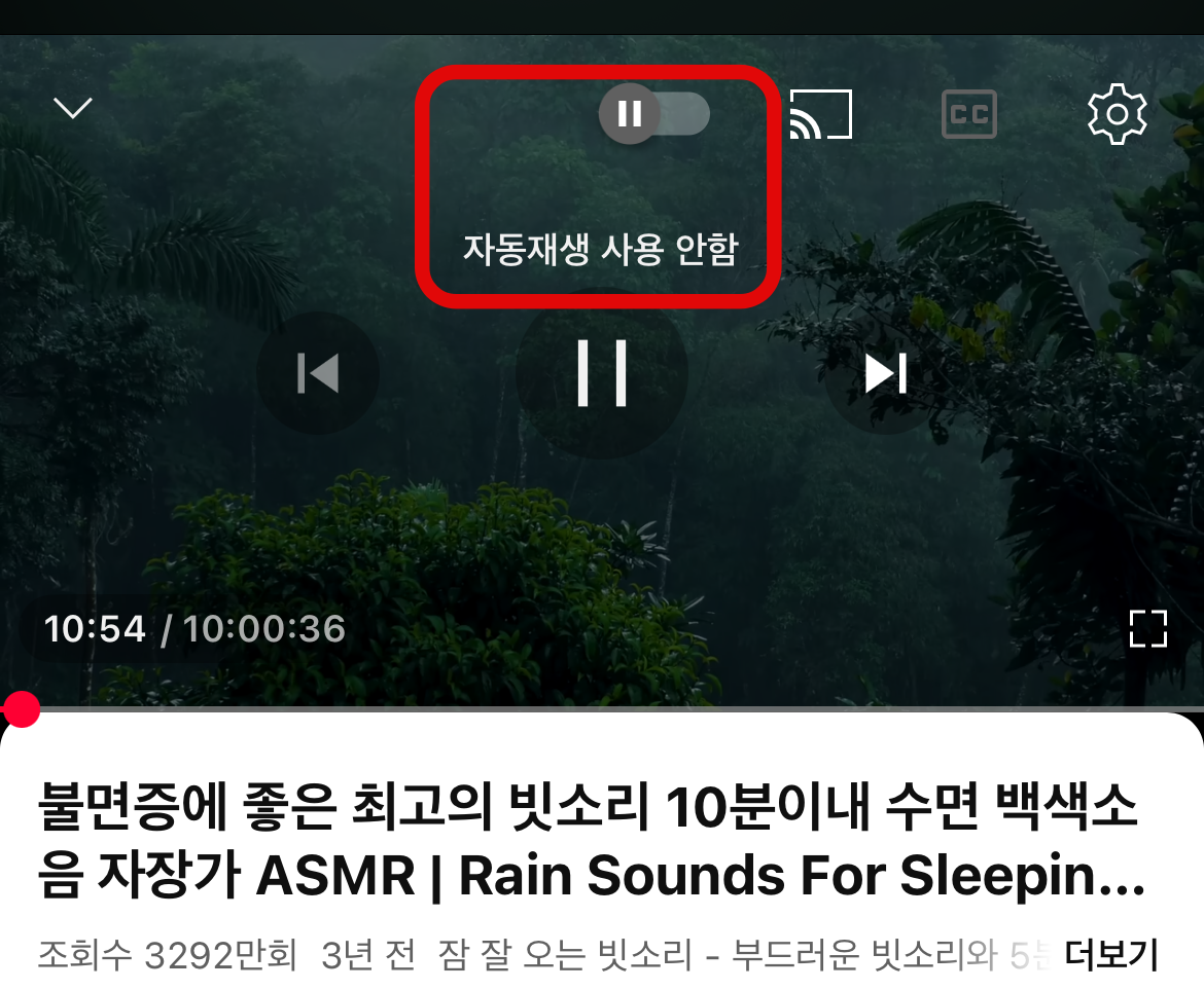 이렇게 영상시간이 긴 유튜브를 시청하는 것이 아니고 10분, 20분짜리 영상을 시청 중이라면 영상 위에 있는 재생버튼을 누르면 자동 재생 사용 안 함이라는 문구와 함께 자동 재생이 꺼질 것이다. 자동재생을 꺼지면 현재 시청 중인 영상이 끝나면 다음 영상을 자동으로 재생을 하지 않고 거기서 유튜브는 멈추고 꺼진다. 유튜브 취침타이머를 굳이 사용하지 않아도 이 기능만 꺼 놓아도 유용하게 사용이 가능할 것이다.