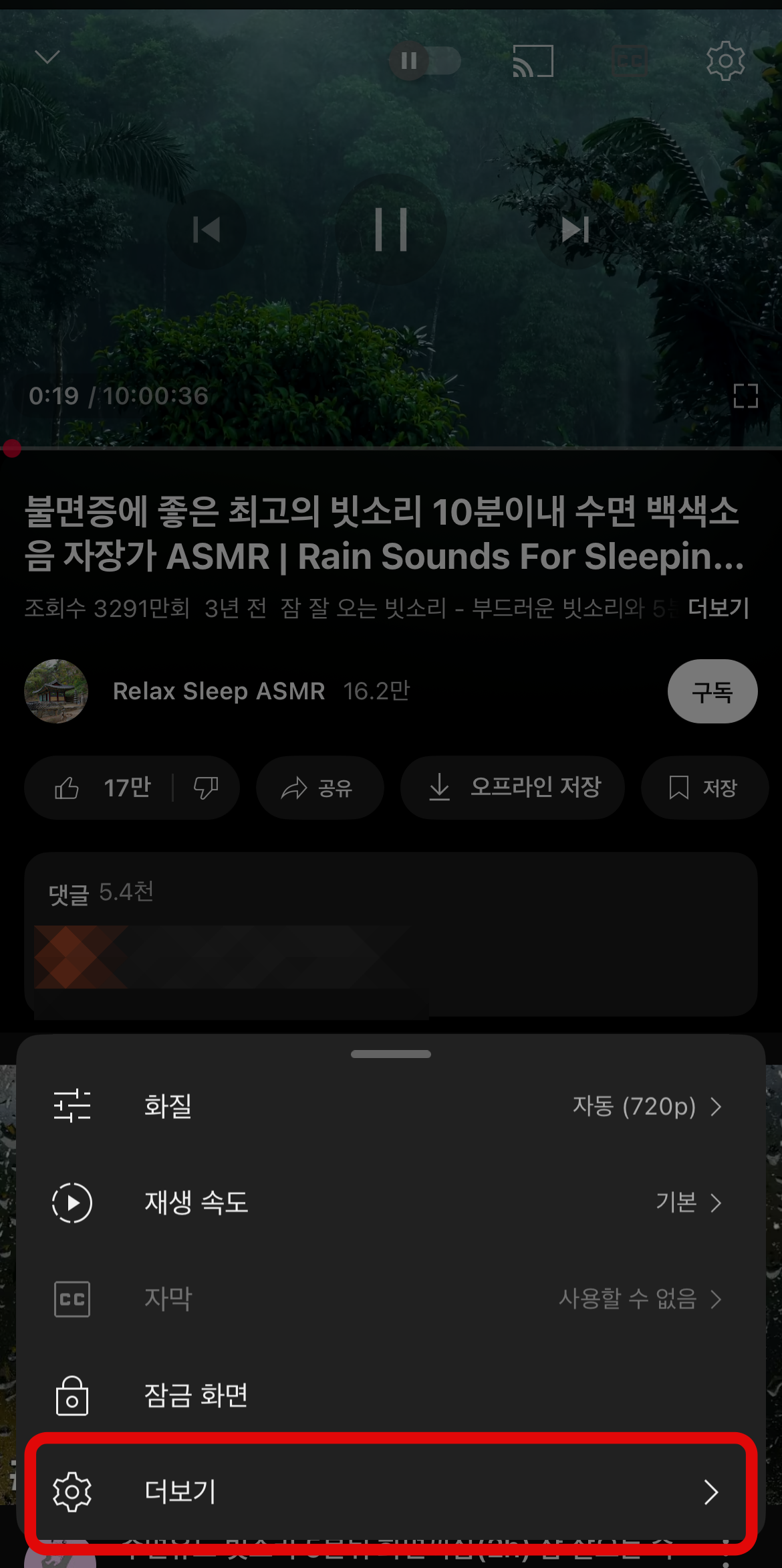 유튜브 취침타이머 설정하는 방법은 매우 간단하다. 먼저 시청을 하려는 영상을 틀고 오른쪽 위에 보이는 톱니바퀴 모양을 눌러보자. 이 동영상에 대한 설정을 할 수 있는데 원래는 여기 취침타이머가 바로 있었는데 여기서 더보기로 들어가면 취침타이머라는 카테고리가 보일 것이다. 영상은 세로모드, 가로모드 상관없이 설정이 가능하다.