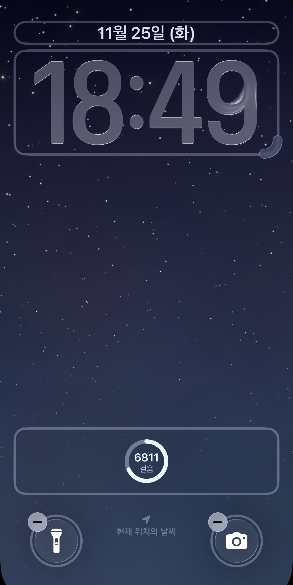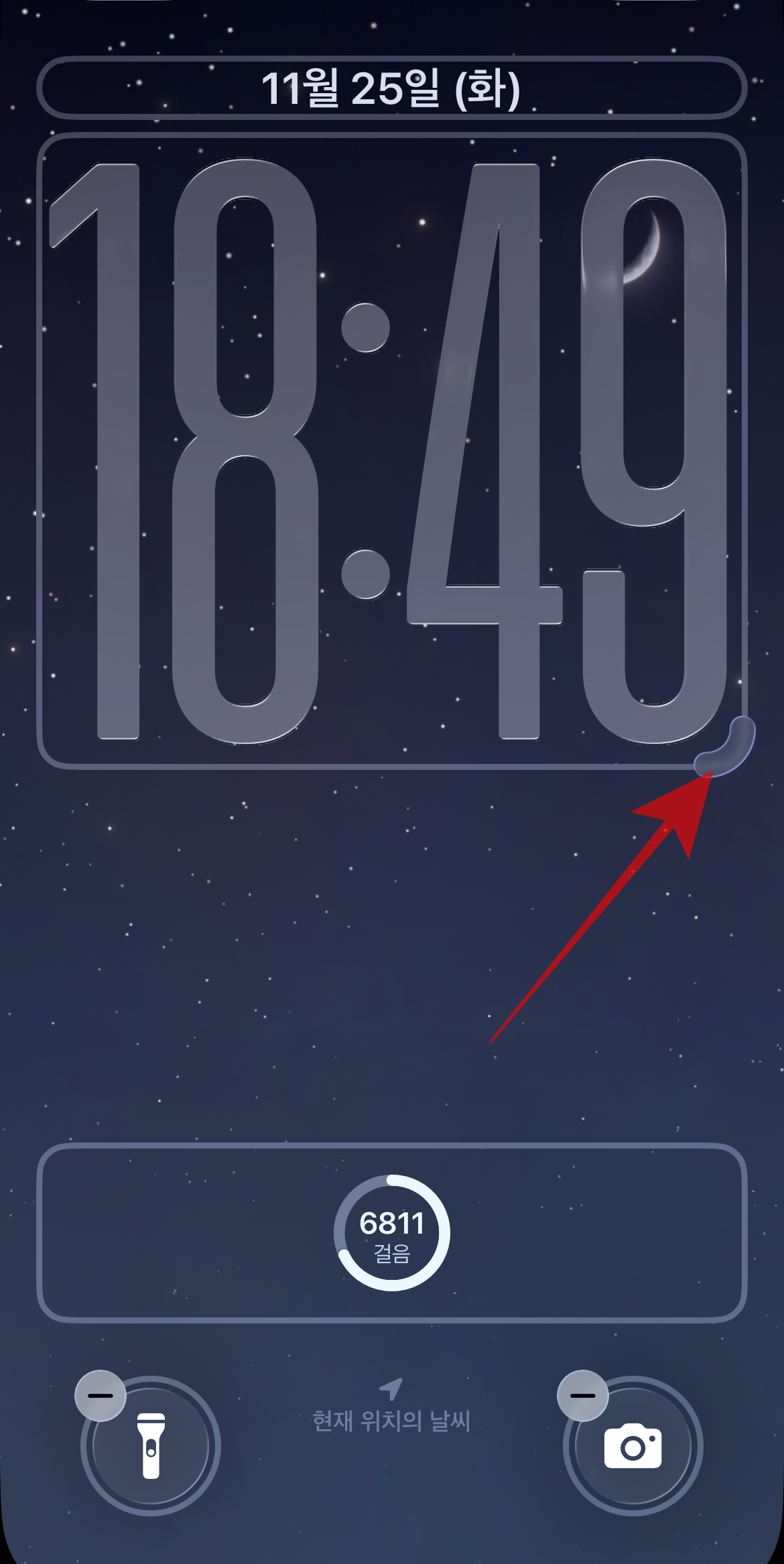 아이폰 시계 늘리기의 첫 번째 조건은 현재 나의 배경화면의 종류이다. 지금 나의 배경화면이 이모지 또는 천체로 되어있다면 위의 방법과 똑같이 진행을 해도 시계 오른쪽 아래에 버튼이 나타나지 않을 것이다.
