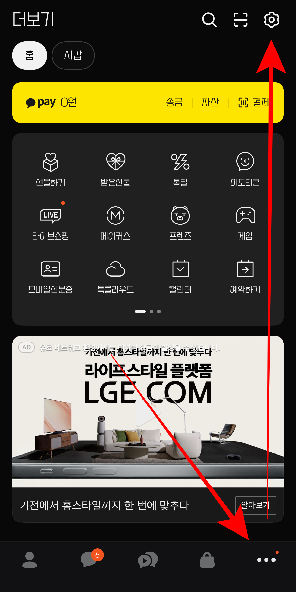 마지막으로 카톡 미리보기 방법은 카카오톡의 기능을 사용하는 것이다. 카카오톡에 들어와서 오른쪽 밑에 있는 점 3개를 누르고 오른쪽 위에 있는 톱니바퀴 모양을 눌러 카카오톡 설정으로 들어가 보자. 여기서 카카오톡에 관한 설정을 할 수 있는데 카톡 미리 보기를 위해서는 알림으로 들어간다. 알림으로 들어가면 미리 보기가 가장 먼저 보일 것이다. 이 미리 보기 기능을 켜주면 카카오톡을 읽기 전에 미리 카톡을 확인할 수 있다.