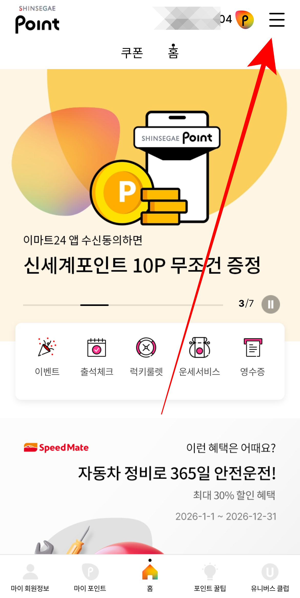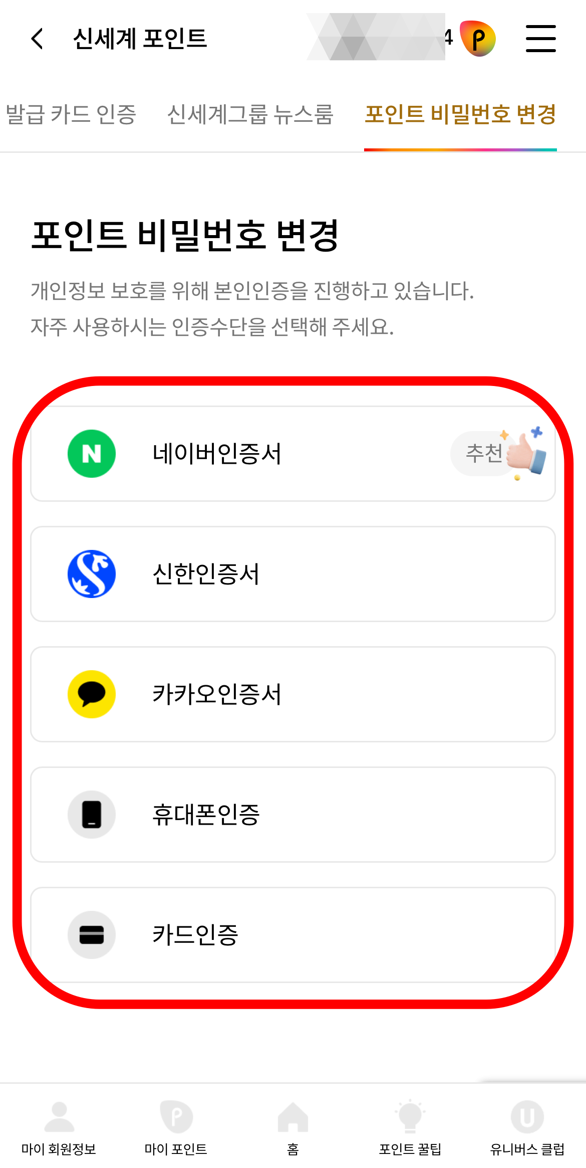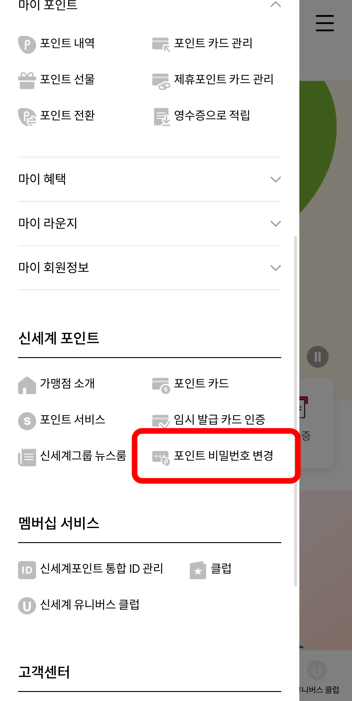 신세계 포인트 비밀번호 재설정을 하기 위해서는 신세계 포인트 어플에 들어와서 로그인 후 오른쪽 위에 있는 선 3개 버튼을 누른다.(어플을 다운로드하지 않고 인터넷에서 신세계 포인트로 들어가서 해도 상관없다.) 그리고 스크롤을 내리다 보면 신세계 포인트 카테고리에서 포인트 비밀번호 변경을 찾을 수 있다. 포인트 비밀번호 변경을 누르고 5가지 중 원하는 걸로 본인인증을 해보자.
