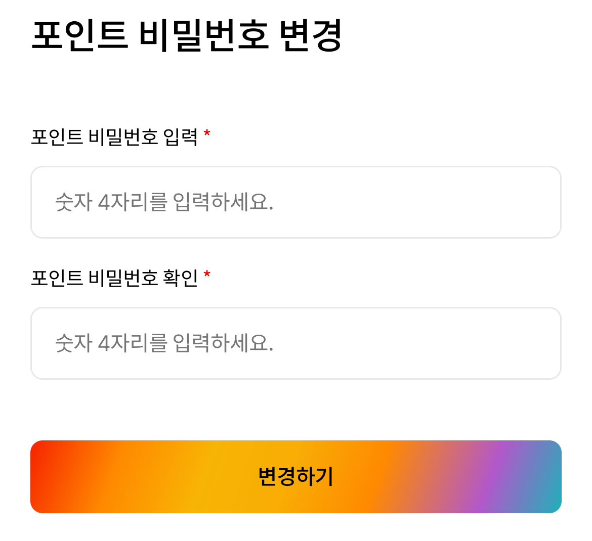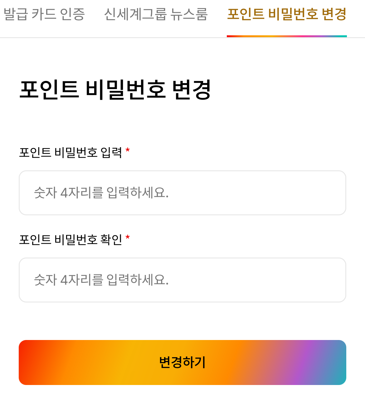 본인인증을 마쳤다면 바로 신세계 포인트 비밀번호 재설정을 할 수 있다. 원하는 비밀번호 4자리를 입력하고 아래에 보이는 변경하기 버튼을 누르면 변경이 완료된다.