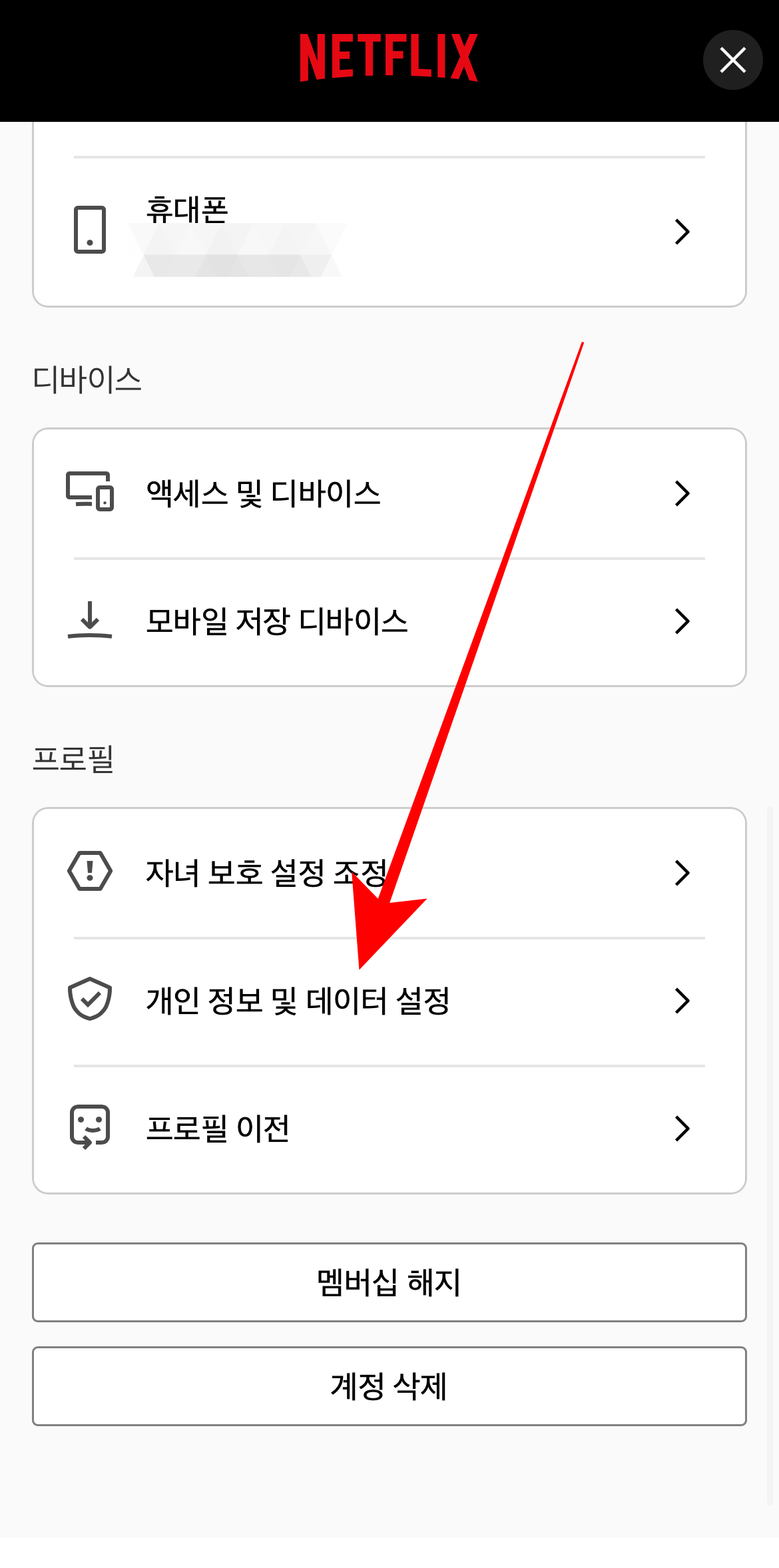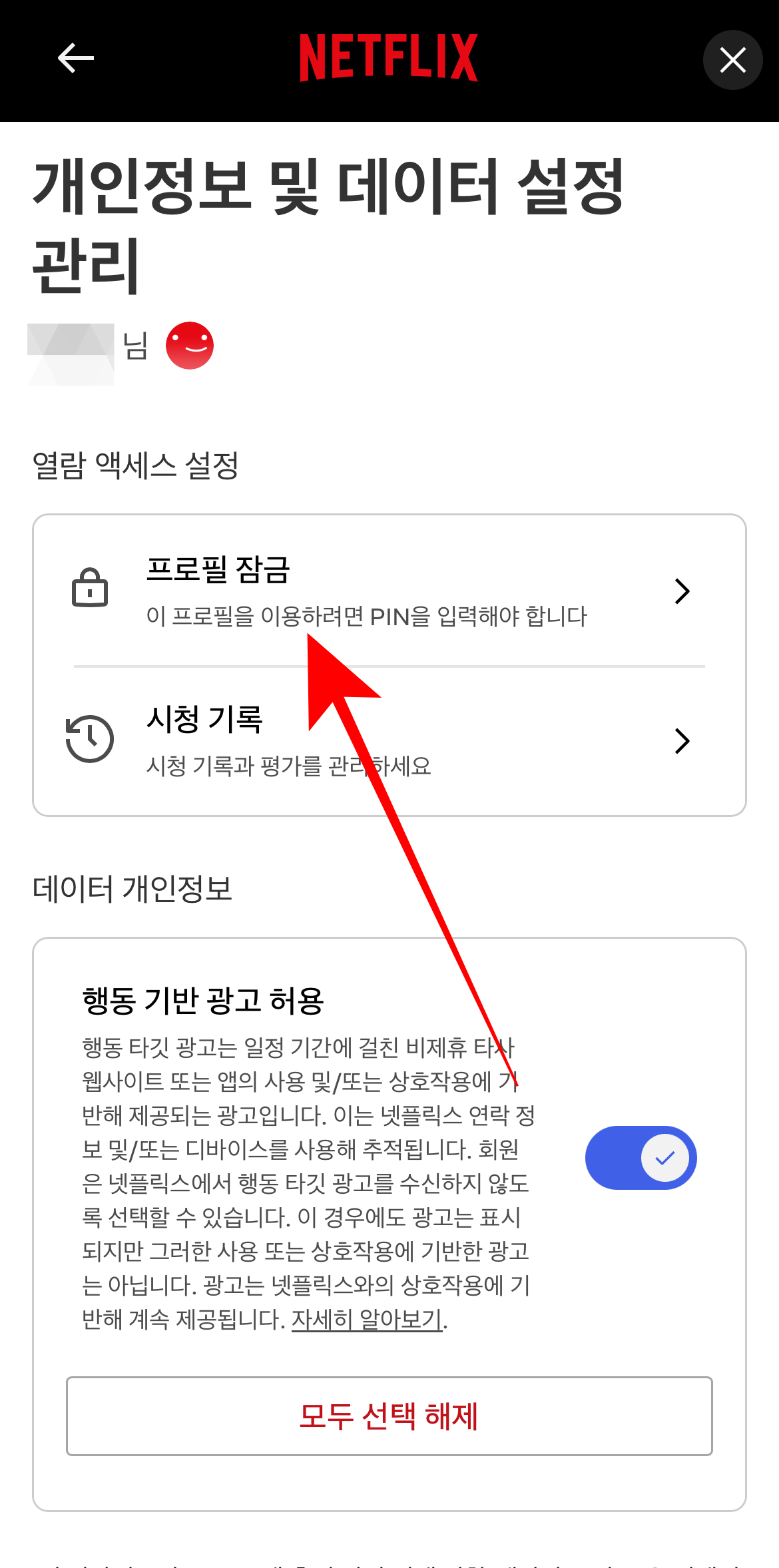 넷플릭스 계정 자체의 비밀번호를 변경하는 방법은 알아보았고 개인 프로필을 잠그는 방법도 알아보자. 넷플릭스 비밀번호 변경하는 방법과 똑 같이 들어와서 보안 탭에 비밀번호가 아닌 프로필 탭에 개인 정보 및 데이터 설정으로 들어가 보자.(해당 프로필로 들어와서 설정을 해야 한다.) 그러면 가장 위에 프로필 잠금이 보일 것이다. 해당 프로필을 비밀번호로 잠글 수 있는 기능이다. 본인인증을 한 번 해야 하니 참고하도록 하자.