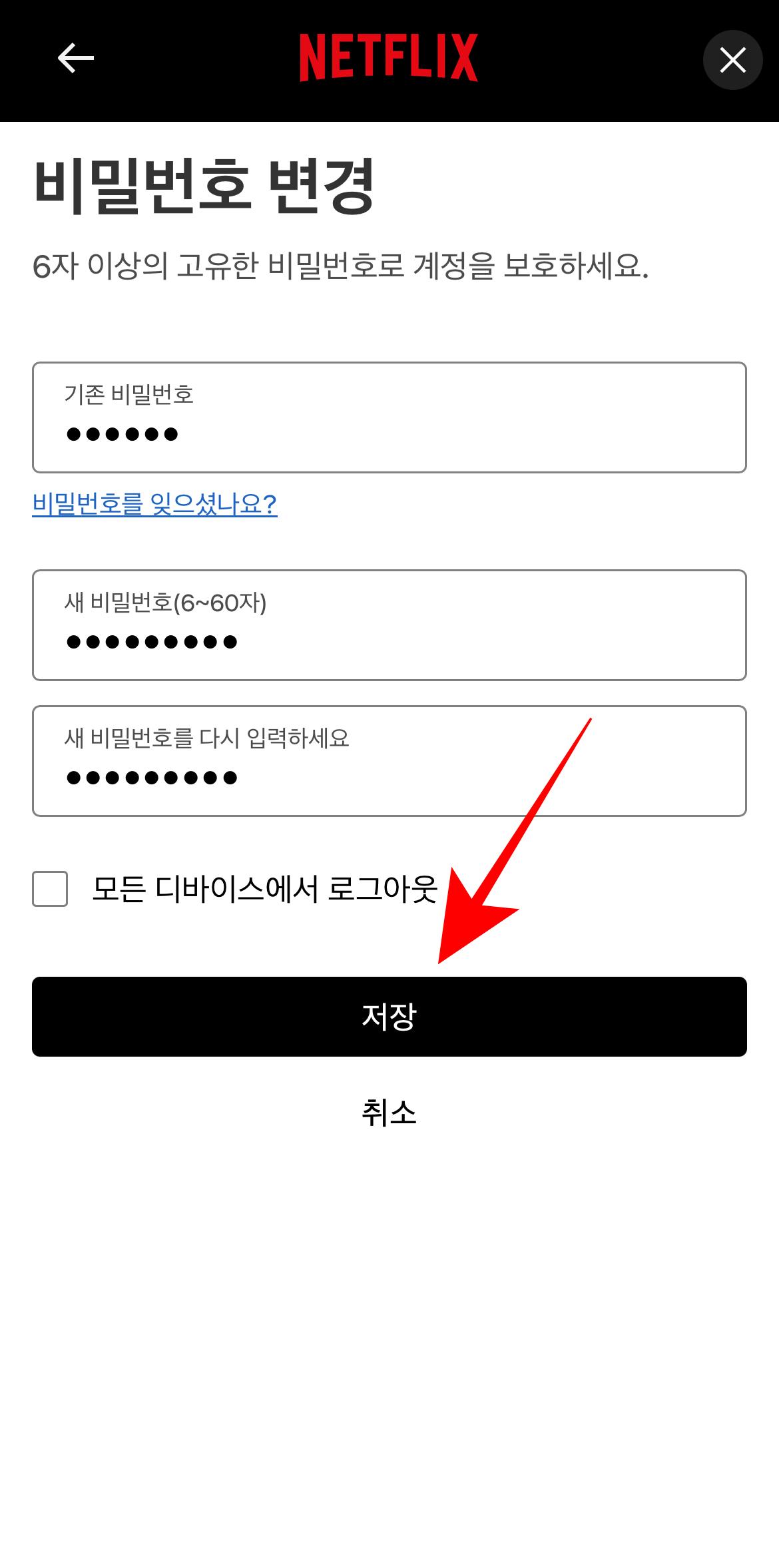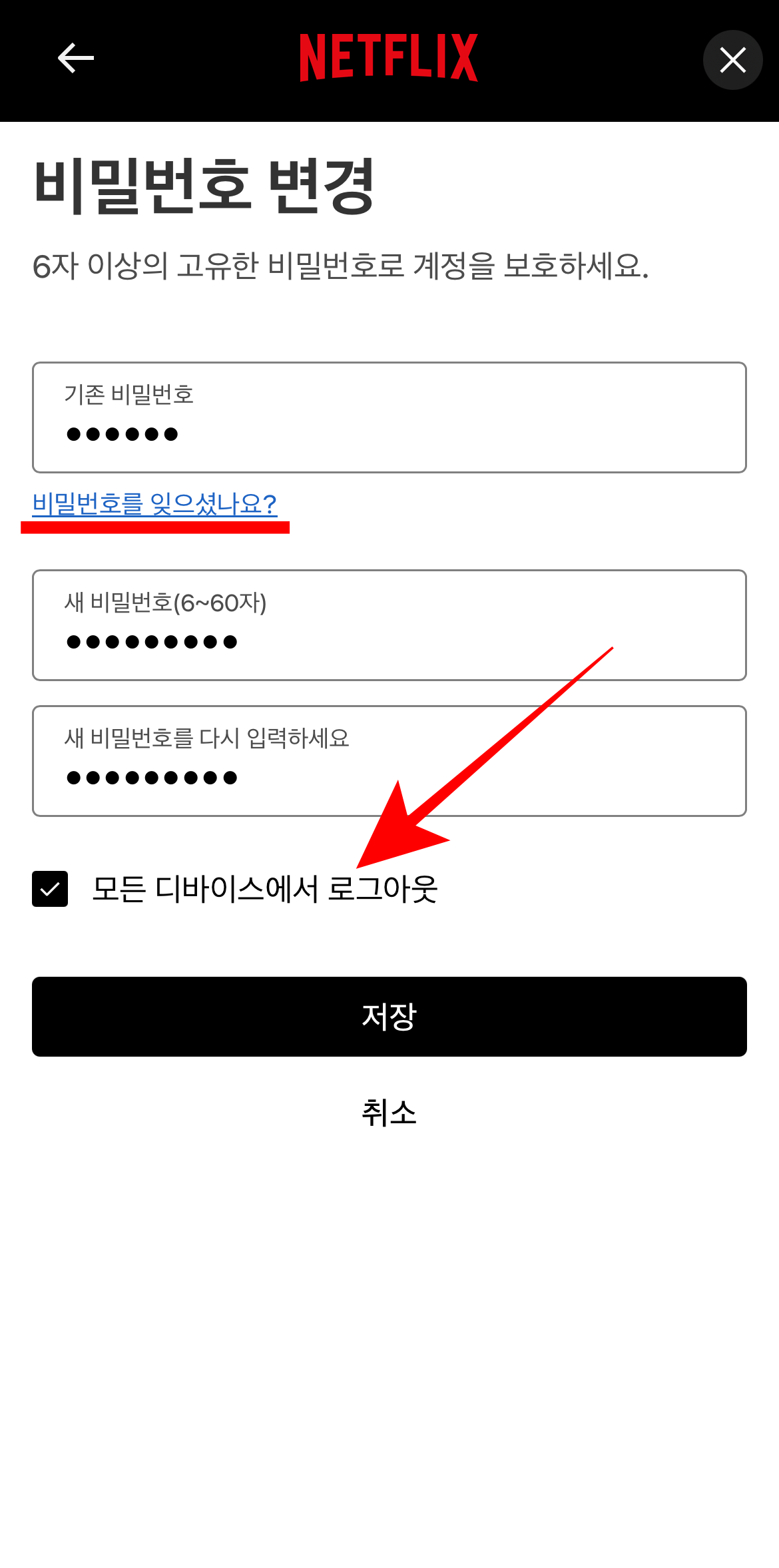 계정으로 들어와서 스크롤을 조금만 내리면 보안 탭에 있는 비밀번호라는 볼 수 있다. 기존 비밀번호를 입력하고 아래에 새 비밀번호를 입력하고 저장을 하면 넷플릭스 비밀번호 변경이 완료된다. 혹시 기존 비밀번호를 까먹었다면 파란 글씨의 '비밀번호를 잊으셨나요?'를 눌러서 찾거나 재설정을 할 수 있다. 그리고 앞서 말한 모든 기기에서 로그아웃 되는 것을 막을 수 있는 방법도 있다. 저장을 누르기 전에 위에 보이는 모든 디바이스에서 로그아웃을 눌러 체크를 풀어주고 저장을 누르면 비밀번호는 변경되는데 기기에서 로그아웃은 되지 않는다.